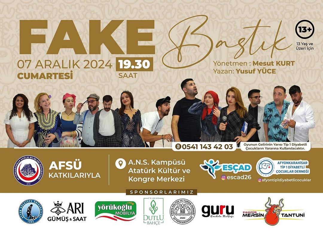 “Fake Bastık” İsimli tiyatro gösterimiz il sınırlarını aştı! Tip1 diyabetli çocuklarımız için, 7 Aralık Cumartesi günü saat 19:30 da Afyonkarahisar Atatürk Kongre Merkezi’nde sahnedeyiz.